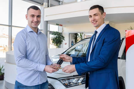 The car salesman handed the keys to the customer who passed the car purchase loan conditions ,Car rental agreement Concept.