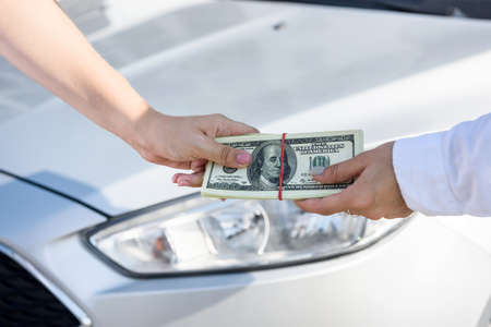 Hands with dollar bundle over car hood. Car sale or car rental concept