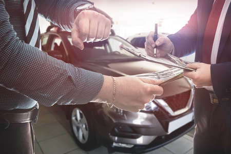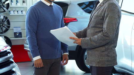 Salesman working with client in showroom, car buy operation