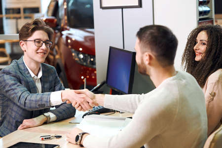 Visiting car dealership. Beautiful young woman is shaking hands with car dealership worker while buying a new car