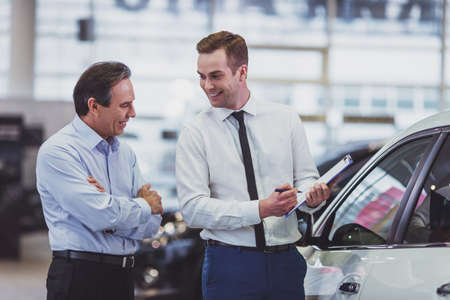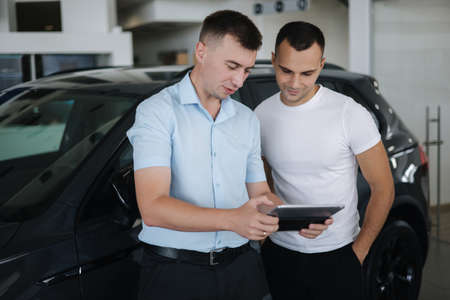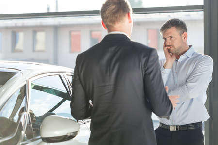 Salesperson selling cars at car dealership. Man choosing car in car showroom