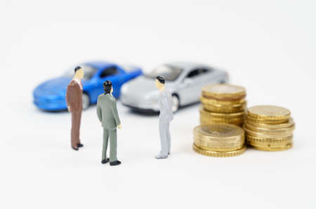 Car business, car sales, deal. On the white surface are cars, coins and miniature figurines of people. Discussing a deal