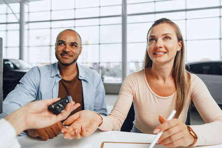Beautiful young couple signs documents at car dealership showroom
