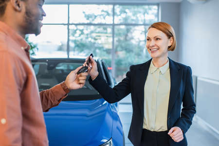 happy car dealer giving key to blurred african american client near car in showroom