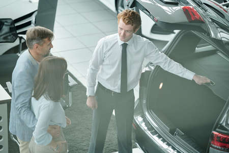 Young sales manager showing his clients all the opportunities of the new model