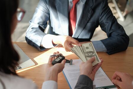 customer giving us money seller for sale or rent new car.