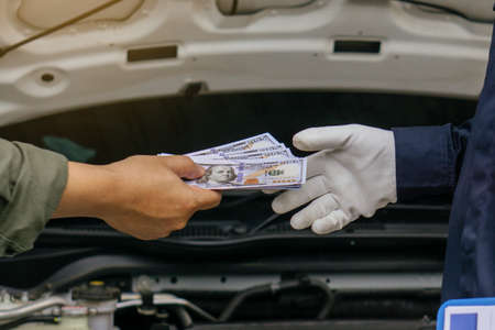 Mechanic man takes cash as payment from customer.after finish checking car system.Professional service.checking the opened hood car.Repair service.