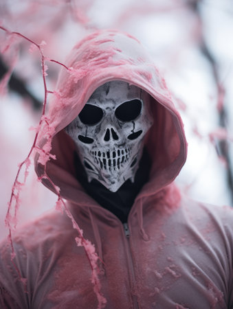 a person wearing a pink hoodie and a skull mask