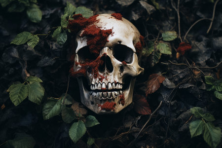 a skull with blood on it is surrounded by leaves