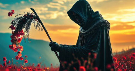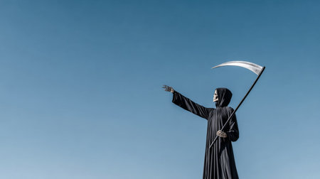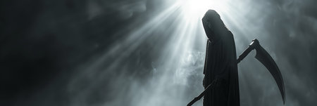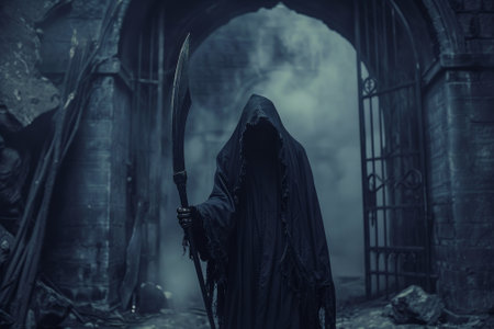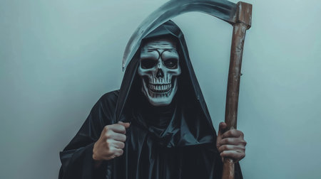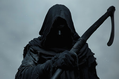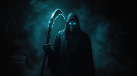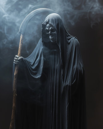Portrait of the grim reaper, the iconic figure of death, wielding a scythe in a haunting depiction