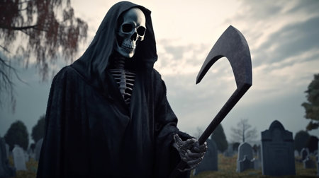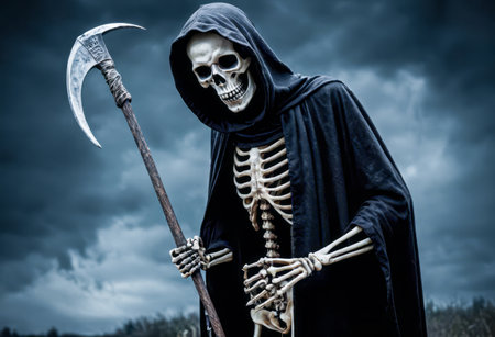 Grim reaper skeleton holding sharp scythe, wearing black hooded robe against dramatic, cloudy sky. Scary, haunting figure symbolizing death, mortality, and afterlife. Halloween, horror themes, spooky