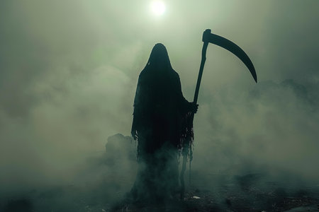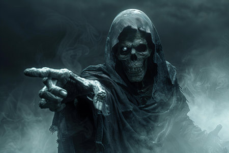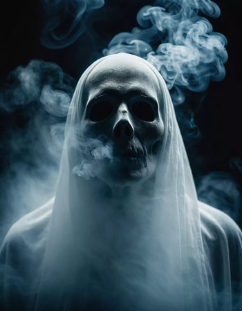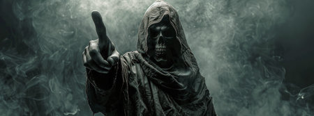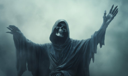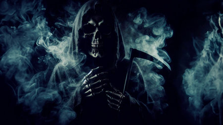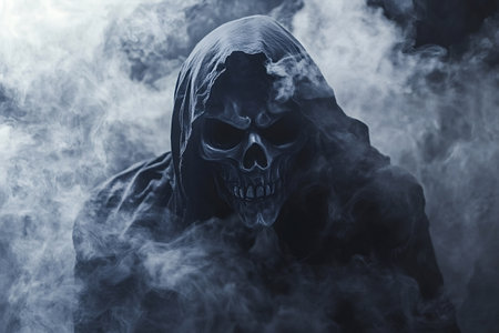 Chilling depiction of the grim reaper shrouded in dark smoke, its skeletal face and hooded figure evoking a sense of dread and the inevitable embrace of death