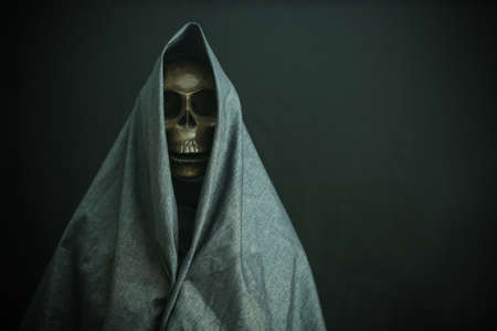 Close up view skull in black hood, on dark background.