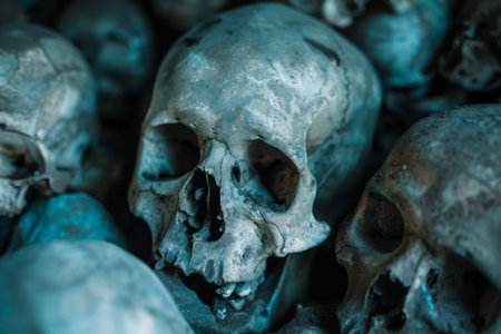 A collection of skulls stacked closely together, forming a pile on the ground. Each skull sits next to the other, creating a macabre scene of death and decay.