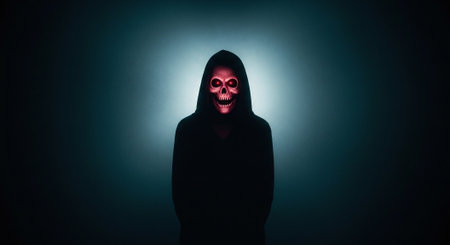ghost halloween fear skeleton hood night horror death creepy evil. Generative AI.