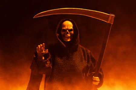 Scary death in the dark with a scythe and smoke
