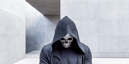 A figure wearing a dark hooded outfit and a skull mask stands in a stark, modern architectural space, creating an intriguing contrast. The surroundings emphasize the mysterious nature of the scene.
