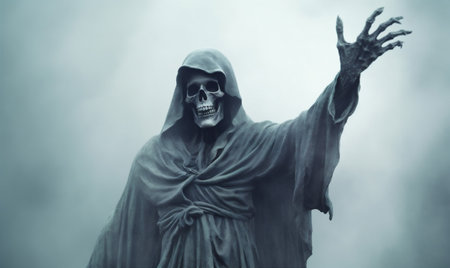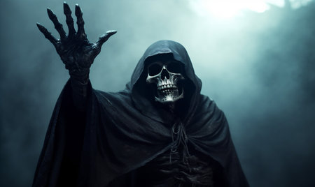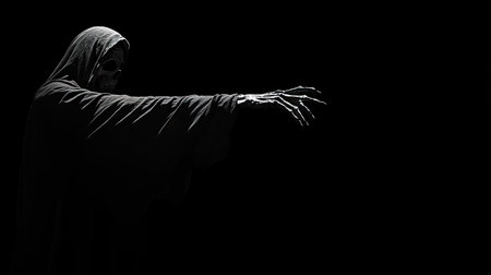 Eerie figure of the grim reaper reaching forward, silhouetted against a black background with space for copy
