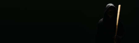 Silhouette of hooligan holding baseball bat under lighting isolated on black, banner