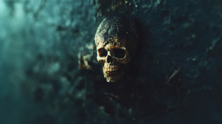 A dark, moody, and atmospheric photograph featuring a skull. The skull is the central focus, with its intricate details and dark, textured surface. The background is blurred, emphasizing the skull as the focal point.