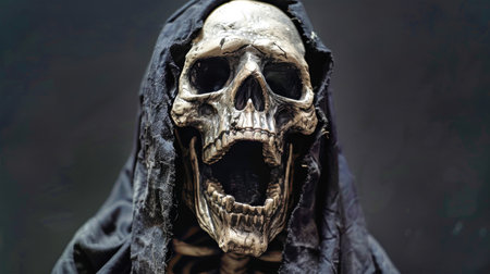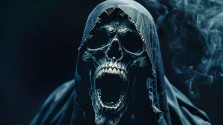 A terrifying grim reaper, cloaked in darkness, screams in fear with an open mouth and wide eyes, creating an eerie atmosphere perfect for Halloween.