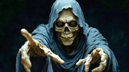 The grim reaper, featuring a detailed skeleton visage, reaches forward with twisted fingers while cloaked in dark blue fabric, set on a deep black backdrop.