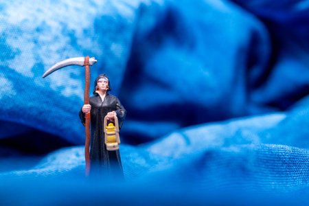 Close-up of a grim reaper miniature figurine holding a scythe and lantern, set against a textured blue fabric background.