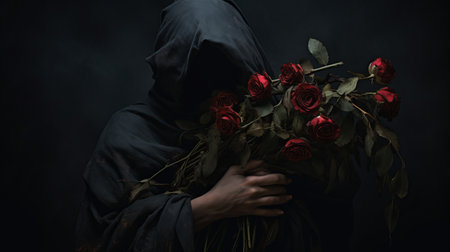 a photo of a person named g is depicted holding a sack in his hand, surrounded by a bunch of roses. the image is inspired by the artistic styles of michal karcz, ingrid baars, meticulous photorealistic still lifes, caravaggism, dramatic and somber religious works, halloween, and flora borsi. ai generated