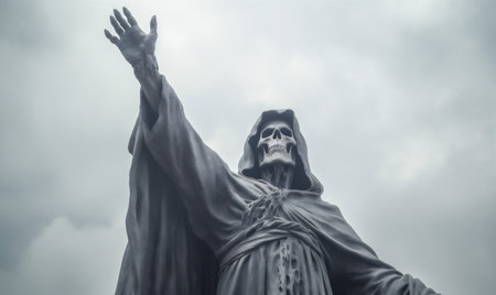 A tall grim reaper statue stands with a scythe, pointing towards the sky. The figure is cast in a black robe against a bright blue background, creating a striking, solemn image.
