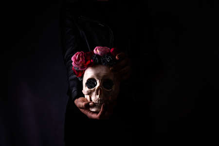 Still life of human skull that died for a long times ,concept of horror or thriller movies of scary crime scene ,The concept of people who die with drugs and Halloween theme, visual art