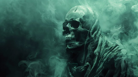 A skeletal figure enveloped in green mist stands silently, evoking deep thoughts about the mysteries and beliefs surrounding the afterlife