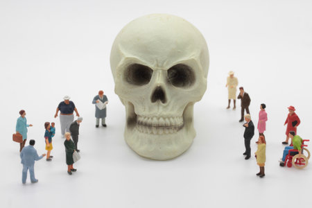 Miniature people engineer and human skull with surgical mask on black background
