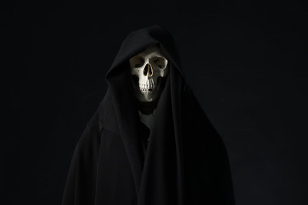 Close up view skull in black hood, on dark background.