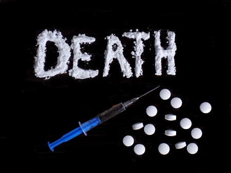 Cocaine drug powder in death word shaped, injection syringe and pills on black background