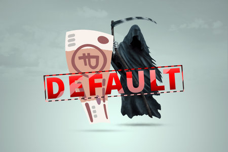 Death with a scythe near the Russian ruble banknote. Economic crisis, bankruptcy, end of economy, mortgage, credit, default. 3D illustration, 3D rendering