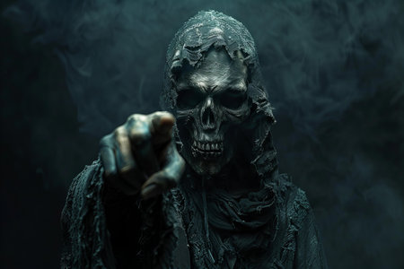 Scary monster or grim reaper ghost coming out of the dark shadows to haunt during Halloween. Depicts a scary and deadly fictitious demon