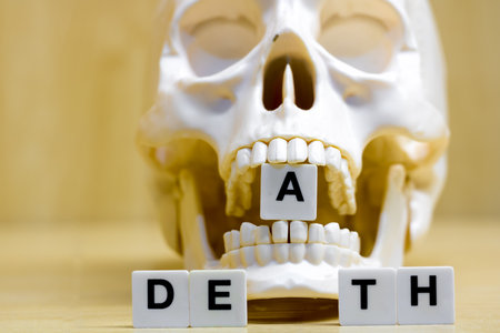 A row of small white plastic tiles, containing the letters forming the word death, placed on a table together with a skull, to represents the concept of death.