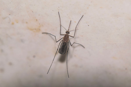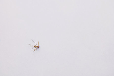 A mosquito lying on a white surface, with extreme closeup. The mosquito