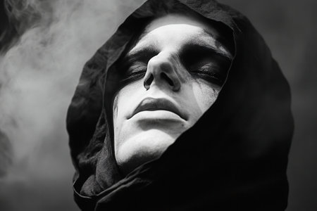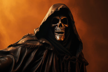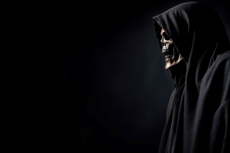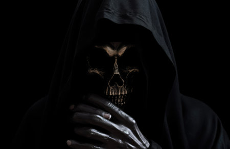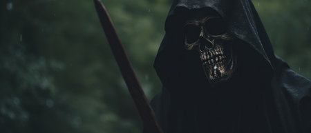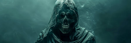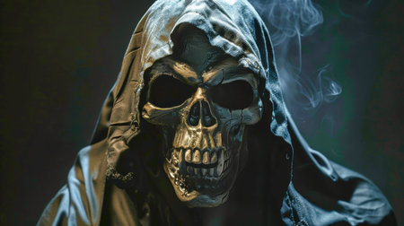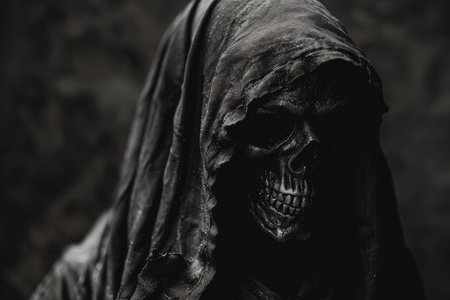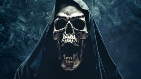 Closeup of a sinister grim reaper figure shrouded in darkness with a skull face