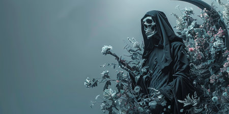 Creepy death with flowers in the background. 3d rendering