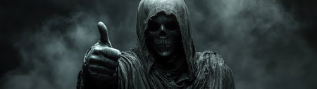 Grim Reaper giving a thumbs up, dark background, eerie approval