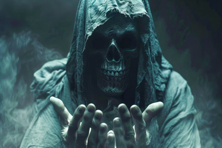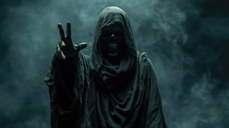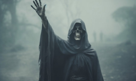 Mysterious Hooded Figure with Skull Face Offering a Menacing Gesture in Eerie Foggy Setting AI Generative
