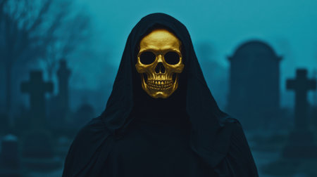 grim reaper in black cloak wearing golden skull mask, haunted halloween cemetery under full moon c 10, Generative AI