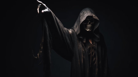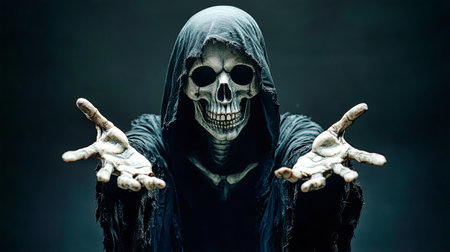Grim reaper reaching towards the camera over dark background, generative ai