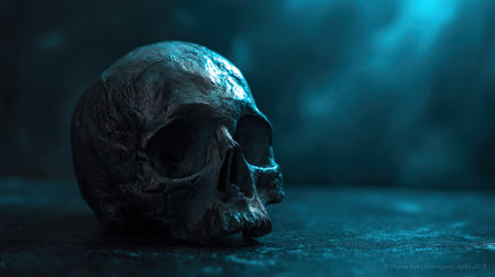 Skulls and bones in underground burial site, eerie, dark tones in a historic cemetery setting