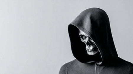 A hooded figure stands with an eerie skull head. The simple background emphasizes the striking contrast of the dark clothing and the skull, creating a haunting effect.