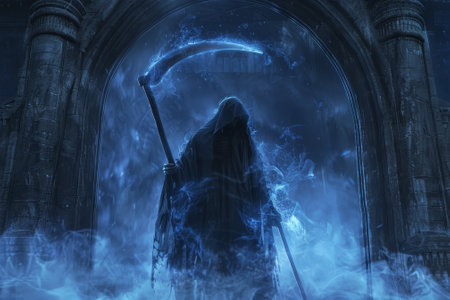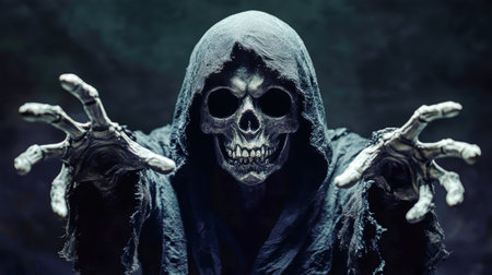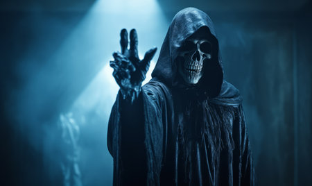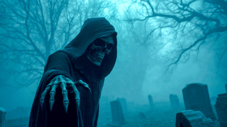 The grim reaper, shrouded in a dark blue cloak, reaches forward with gnarled fingers, creating an eerie and captivating atmosphere in a dark setting.