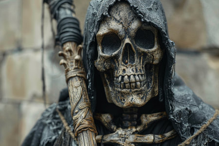 Death grim Reaper skeleton wearing a black robe and wielding a scythe