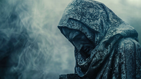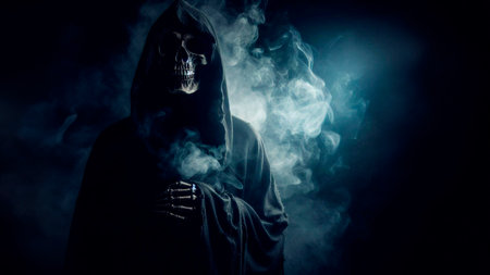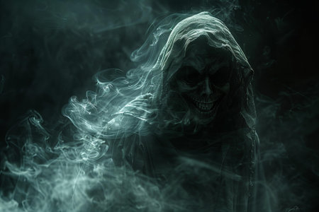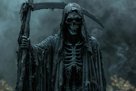 Mysterious Grim Reaper in Dark Misty Atmosphere.