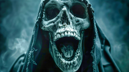 The grim reaper's skull face screams in horror, enveloped in shadows, creating a chilling atmosphere perfect for Halloween-themed events.
